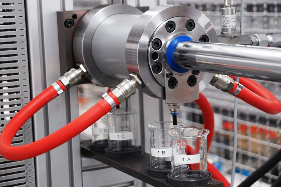 L'installation, qui a été présentée au public spécialisé fin 2015, a maintenant terminé sa phase d'essai. L'élément central est constitué de quatre axes d'essai à entraînement hydraulique qui testent chacun deux chambres d'essai avec des combinaisons de joints définies. Les quatre axes peuvent être utilisés avec différents types de pièces à tester et paramètres. La course de l'installation peut être choisie librement en fonction de la tige. Des vitesses allant jusqu'à 4 m/s sont possibles. Lors du fonctionnement parallèle autonome des 4 tiges, il est possible d'atteindre jusqu'à 1 m/s, la fréquence peut atteindre jusqu'à 5 Hz.