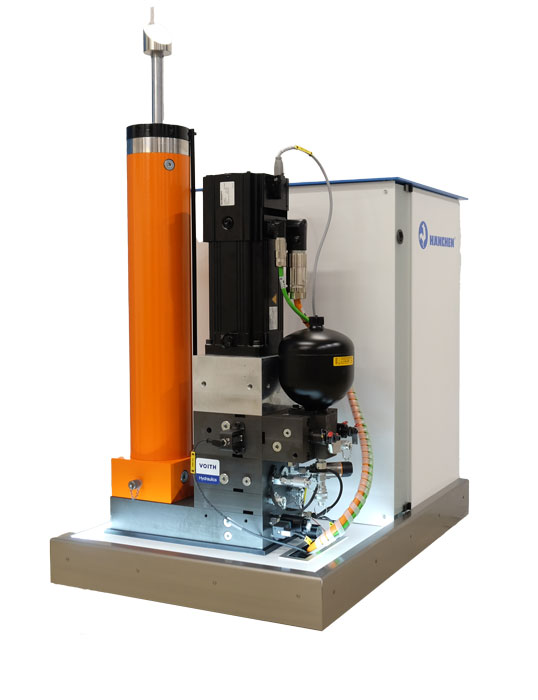 Le nom CLDP signifie 'Closed Loop Differential Pump' de Voith à Rutesheim et est un servomoteur avec pompe intégrée. Ainsi, cet entraînement hydraulique ne doit être raccordé que mécaniquement, électriquement et électroniquement et fonctionne ensuite sans maintenance pendant une durée de 3 ans ou 20 000 heures. Voith fournit l'ensemble complet, dont l'élément d'entraînement utilise un vérin hydraulique de Herbert Hänchen GmbH. Ainsi, l'utilisation d'un système hydraulique haute performance sans propre savoir-faire hydraulique est possible aussi bien pour l'utilisateur que pour le fabricant de machines et d'installations - et ce, dans un système sans vanne avec un rendement optimal. « Le vérin hydraulique est nettement supérieur à l'entraînement à broche, notamment pour les forces importantes. Outre une manipulation plus simple des forces importantes, il présente une usure nettement moindre », explique Dipl.-Ing. Harald Branz, chef de projet responsable des ventes chez Voith. « Et la construction sans vanne permet d'obtenir une efficacité énergétique inégalée. » Mais de nombreux clients hésitent aujourd'hui à recourir à l'hydraulique, car ils n'ont plus leurs propres spécialistes. Le rapport coût/bénéfice et la densité de force élevée de cette technique restent toutefois inégalés. Le CLDP est un appareil haute performance que le client peut utiliser sans aucune compétence hydraulique propre.