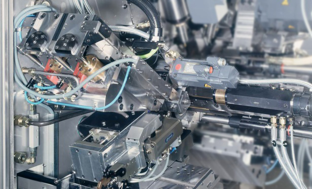 Aujourd'hui, jusqu'à 8 broches sont utilisées dans un automate. Elles sont disposées circulairement autour de l'axe de rotation central. L'espace disponible étant très limité, les entraînements d'avance des broches sont imbriqués les uns dans les autres, ce qui impose des exigences élevées à une construction compacte de l'entraînement de broche. Une précision supérieure à 1 µm impose des exigences particulières aux entraînements d'avance des machines, qui doivent combiner précision, vitesse, force et compacité. C'est depuis longtemps un domaine d'application typique des vérins hydrauliques. Les entraînements linéaires précis pour les chariots longitudinaux de ces machines sont fournis par Herbert Hänchen GmbH & Co. KG à Ostfildern. Il y a jusqu'à 15 vérins par machine.