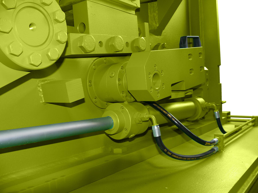 Les machines broient jusqu'à 4 tonnes de tous les matériaux coupables par heure en tailles de grains de 20 mm maximum. Des barres de déchiquetage de rotor massives et ondulées se déplacent – entraînées par un moteur de 355 kW – devant des barres de déchiquetage de stator. Grâce à une inversion régulière, c'est-à-dire un changement de direction du rotor, elles s'affûtent automatiquement. Ici, un premier vérin Hänchen est utilisé, au milieu de la zone du clapet d'entrée. Dans la partie inférieure du corps de la machine, un tamis aux dimensions généreuses est installé. Celui-ci maintient le matériau dans l'espace de travail jusqu'à ce qu'il puisse être évacué par les perforations du tamis. Deux autres vérins déplacent des tamis lourds qui sont rabattus en cas de besoin ou lors du changement de couteau. Ces vérins hydrauliques sont également constamment exposés aux influences environnementales de la saleté et des vibrations. Un autre vérin hydraulique pousse la barre de couteaux vers l'extérieur à des fins de maintenance : il est monté avec une course de 1700 mm, un diametre tige de 50 mm et un alésage de 80 mm. En fonctionnement normal, la tige de piston est constamment sortie et le matériau recyclable broyé tombe constamment sur le vérin. Ainsi, des forces statiques et des vibrations élevées se produisent, ce qui sollicite particulièrement la combinaison de joints. Outre une peinture spéciale et une position spéciale des douilles, ce composant est également un produit de catalogue chez Hänchen, ce qui a un effet très positif sur le prix et la fiabilité. Le dernier vérin déplace un moteur hydraulique pour faire tourner le rotor à des fins de maintenance. Comme pour toutes les autres installations comparables, le système hydraulique du Tiger, y compris le groupe et l'accumulateur aux dimensions généreuses, est fourni par Pallmann.